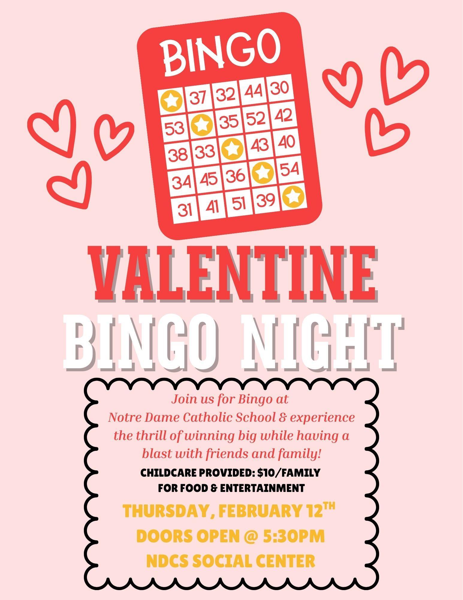 Our 2025-2026 annual Valentine BINGO Fundraiser is presented by the Notre Dame Parent Teacher Club (PTC) during the second week of February. Play BINGO with your sweetheart and your sweet kids! Enjoy an exciting evening with friends and family while playing multiple cards for a chance to win some great prizes! Please consider being a prize sponsor and/or volunteering.